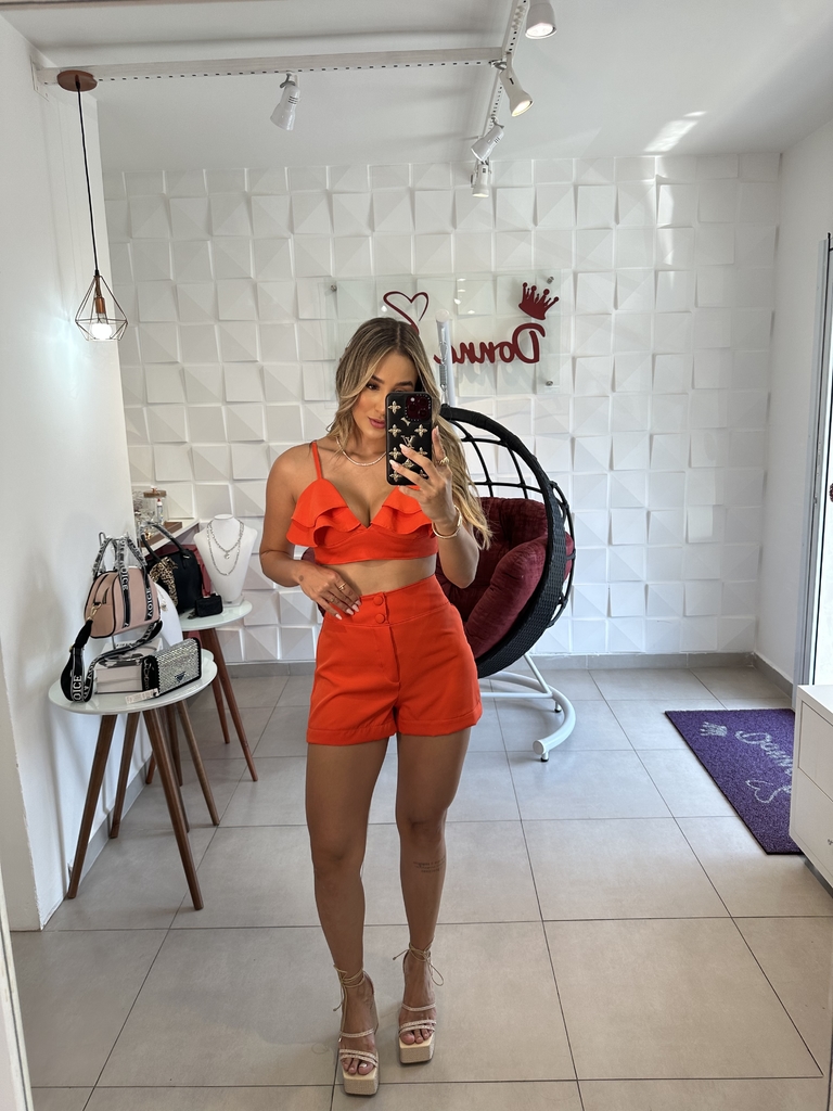 Renove seu estilo com o Conjunto de short em alfaiataria que traz todo o charme dos babados no cropped e o detalhe sofisticado dos botões encapados. Esta peça é ideal para quem busca um look moderno, feminino e versátil para diversas ocasiões.